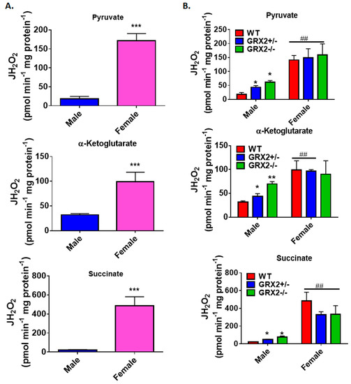 A previously published study by our group showed that deleting the Grx2 gene had opposite effects on ROS production from male liver mitochondria energized with pyruvate, α-ketoglutarate, or succinate [17]. Loss of GRX2 significantly diminished ROS production from mitochondria oxidizing pyruvate or α-ketoglutarate whereas it had the opposite effect on succinate metabolism [17]. Based on our findings above, we decided to compare the ROS production profiles of male and female littermates oxidizing these three substrates to ascertain if sex affected H2O2 production. Figure 2A shows that mouse sex has a significant impact on the rate of H2O2 production when pyruvate, α-ketoglutarate, or succinate are fueling ROS genesis. Liver mitochondria prepared from male WT mice generated ~3.5-fold and ~5-fold more ROS than their female counterparts when pyruvate or α-ketoglutarate, respectively, were serving as substrates (Figure 2A). Intriguingly, the opposite effect was observed in female liver mitochondria energized with succinate; a small but significant increase in H2O2 formation was observed when compared to male WT littermates (Figure 2A).