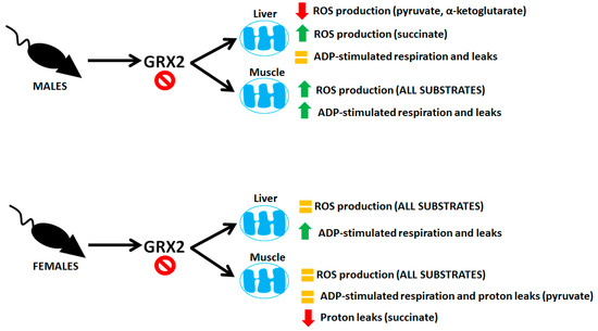 Sexual dimorphisms in biochemical and physiological characteristics is a common feature found in animals due to differences in genetic and epigenetic coding and hormonal signaling. Mitochondria display sex-specific differences in function as well, which is related to differences in hormone signaling and expression of mitochondrial proteins encoded in nuclear DNA [22]. Understanding the sexual dimorphisms of mitochondria is critical for health research because dysfunctional bioenergetics can have sex-dependent effects on the manifestation of disorders and metabolic diseases. Protein S-glutathionylation reactions have emerged as an important means of controlling mitochondrial functions. Additionally, deregulation of mitochondrial S-glutathionylation signals can have profound pathological consequences, causing heart disease, hypertension, cataracts, obesity, and perturbations in embryonic development (reviewed in [23]). However, research into the role of these reversible and redox-sensitive switches in modulating bioenergetics has been exclusively carried out using male rodent models [17,24,25,26,27]. Here, we have shown that mice carrying a deletion for the gene encoding GRX2, a thiol oxidoreductase that catalyzes reversible S-glutathionylation of proteins in the matrix, display sex differences in mitochondrial bioenergetics. Our results and the sex differences in the bioenergetics of liver and muscle mitochondria from male and female mice containing the Grx2 gene deletion are summarized in Figure 7.