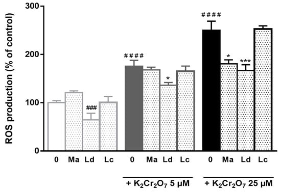 Effect of M. aquatica, L. dentata and L. cardiaca hydroethanolic extracts (at 50 µg/mL) in ROS production in HepG2 cells in the absence or presence of 5 or 25 μM of potassium dichromate. Values are expressed as means ± S.D. of percentage of ROS production with respect to the control (untreated cells). K2Cr2O7, potassium dichromate; Ma, M. aquatica extract; Ld, L. dentata extract; Lc, L. cardiaca extract.