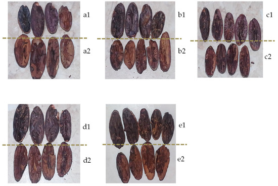 Cocoa bean cross-section photos (taken by authors); (a1) unroasted Colombia, (a2) roasted Colombia, (b1) unroasted Dominican Republic, (b2) roasted Dominican Republic, (c1) unroasted Ecuador, (c2) roasted Ecuador, (d1) unroasted Ghana, (d2) roasted Ghana, (e1) unroasted Venezuela, (e2) roasted Venezuela.