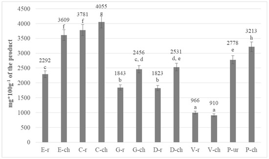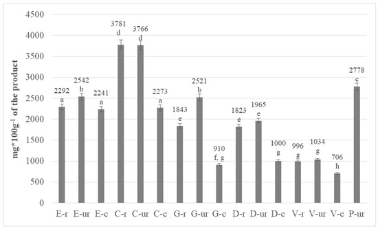 A total content of polyphenols in the research material was determined. The results were calculated in terms of gallic acid equivalent, as shown in Figure 2. The results for roasted cocoa beans in their entirety (marked with the letter “r”), middlings-crushed cocoa beans (marked with the letter “c”) and whole unroasted cocoa beans (marked with the letters “ur”) were presented.