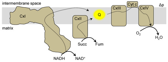 Mitochondrial electron transport chain. The electron transport chain (ETC) is located in the mitochondrial inner membrane. Electrons (dashed lines) from reducing equivalents (e.g., NADH) enter the ETC at complex I (CxI) or complex II (CxII) and reduce the ubiquinone pool (Q, yellow). Electrons are then transferred from QH2 to complex III (CxIII), to cytochrome c (Cyt c) and ultimately onto oxygen (O2) at complex IV (CxIV). During this process protons are pumped (not shown) to generate a protonmotive force (Δp) which is comprised of a membrane potential and a proton concentration gradient.