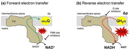 The electron flow in complex I is described in two modes—forward and reverse electron transfer (Figure 2). Under conditions of normal respiration, forward electron transfer (Figure 2a) is the energetically favored complex I-mediated transfer of electrons from NADH to Q. Reverse electron transfer (RET) (Figure 2b) is the backward transfer of electrons from QH2 to NAD+ [2,12]. Under normal conditions, RET is energetically uphill and requires a high Δp and QH2/Q ratio [30,41,42]. RET is not tissue or organ specific, as it occurs in mitochondria from different tissues [17,33,35,39,42,43]. In addition, though RET was first observed under conditions of succinate respiration in isolated mitochondria, it is not linked solely to this condition. Mitochondria fueled with fatty acids or α-glycerophosphate to reduce Q can undergo RET [1,21], suggesting that RET can be influenced by multiple metabolic pathways.