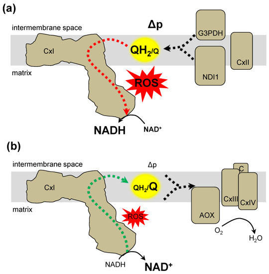Complex I electron transfer. (a) Forward electron transfer. Electrons (dashed lines) are transferred from NADH to ubiquinone (Q) resulting in ubiquinol (QH2). These conditions can generate reactive oxygen species (ROS). The addition of FMN site inhibitors prevent, while Q binding site inhibitors enhance complex I forward electron transfer generated ROS. (b) Reverse electron transfer (RET). Electrons from ubiquinol (QH2) are transferred to NAD+ and generate ROS. Both Q binding site and FMN binding site inhibitors suppress RET generated ROS. Δp, protonmotive force; FMN, flavin mononucleotide.