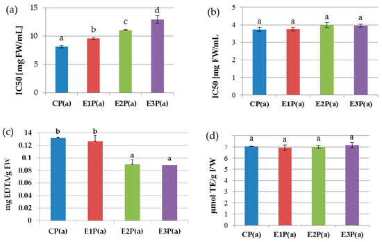 Antioxidant properties of purified anthocyanin fractions from pomace made from raspberries subjected to enzymatic maceration: (a) ability to neutralize DPPH• radicals (b) ability to neutralize the radicals of ABTS•+, (c) ability to chelate iron ions, (d) reduction power (FRAP). Mean values marked with the same letters do not differ significantly in terms of p ≤ 0.05. Symbols: CP(a)—purified anthocyanin fraction from pomace obtained from control raspberry pulp; E1P(a)—purified anthocyanin fraction from pomace obtained from raspberry pulp macerated with Pectinex Ultra SP-L; E2P(a)—purified anthocyanin fraction from pomace obtained from raspberry pulp macerated with Pectinex Yield-Mash; E3P(a)—purified anthocyanin fraction from pomace obtained from raspberry pulp macerated with Ultrazym AFP-L.