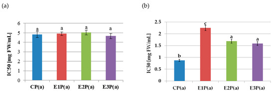 Figure 1a shows the antioxidant properties of the anthocyanin fraction isolated from the pomaces. The highest ability to neutralize DPPH radicals was exhibited by anthocyanins isolated from the control pomace—CP(a) (IC50 = 8.15 mg FW/mL), whereas the lowest value was determined for anthocyanins isolated from the pomaces obtained from raspberry pulp treated with Ultrazym AFP-L – E3P(a) – IC50 = 12.92 mg FW/mL). The statistical analysis showed a high negative correlation between the IC50 value and the anthocyanin concentration (r = −0.89).