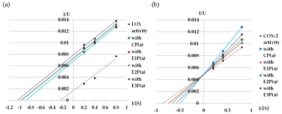 Lineweaver–Burk plot of (a) LOX, (b) COX-2 inhibition by purified anthocyanin fractions from pomace obtained from raspberries subjected to enzymatic maceration. Symbols: CP(a)—purified anthocyanin fraction from pomace obtained from control raspberry pulp; E1P(a)—purified anthocyanin fraction from pomace obtained from raspberry pulp macerated with Pectinex Ultra SP-L; E2P(a)—purified anthocyanin fraction from pomace obtained from raspberry pulp macerated with Pectinex Yield-Mash; E3P(a)—purified anthocyanin fraction from pomace obtained from raspberry pulp macerated with Ultrazym AFP-L.