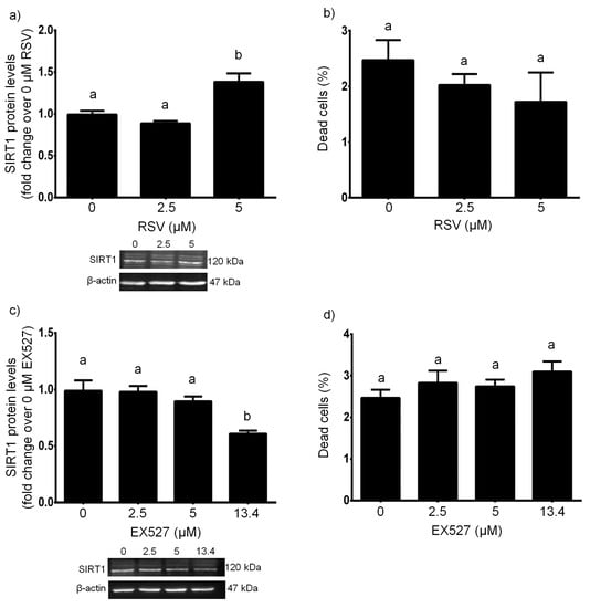 Effects of a 24-h treatment with either resveratrol (a,b) or EX527 (c,d) on sirtuin 1 protein levels (a,c) and cell death (b,d) in HUVECs. Representative blots are also shown (a,c). Data are expressed as means and S.E.M. Abbreviations: RSV resveratrol, SIRT1 sirtuin 1. Means sharing the same letter are not significantly different from each other (one-way ANOVA and Tukey’s multiple comparisons test): Panel (a): a vs. b, p < 0.01 (N = 4); Panel (b): (N = 5); Panel (c): a vs. b, p < 0.05 (N = 4); Panel (d): (N = 4–9).