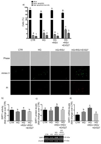 As expected, EX527 (i.e., a specific inhibitor of SIRT1) abolished the RSV-induced increase in SIRT1 activity (p > 0.05, HG + RSV + EX vs. HG; Figure 2b) and decrease in protein (p > 0.05 HG + RSV + EX vs. HG; Figure 2c). In addition, in the presence of inhibitor, SIRT1 transcriptional expression was repressed to levels observed in untreated cells (p > 0.05 HG + RSV + EX vs. CTR; Figure 2d). Such downregulation was associated to a failure for RSV to elicit cytoprotective effects in HG-challenged HUVECs, as shown by the diminished cell viability (p < 0.001, HG + RSV + EX527 vs. HG + RSV) and increased cell death (both apoptotic and necrotic; p < 0.001, HG + RSV + EX527 vs. HG + RSV), with respect to cells treated with the combination HG + RSV (Figure 2a).