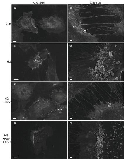 Effect of a 24-h treatment with either resveratrol alone (5 µM) or resveratrol + EX527 (5 µM and 13.4 µM, respectively) on cell membrane response of high glucose-challenged HUVECs. Representative scanning electron microscope images are shown. Bars: 10 µm (a,c,e,g), 1 µm (b,d,f,h). Abbreviations: CTR—vehicle; HG—high glucose; HG + RSV—high glucose + resveratrol; HG + RSV + EX527—high glucose + resveratrol + EX527.