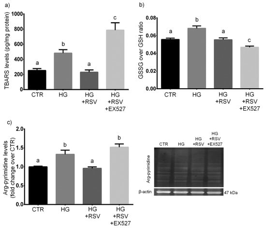 Effects of a 24-h treatment with either resveratrol alone (5 µM) or resveratrol + EX527 (5 µM and 13.4 µM, respectively) combination on TBARS levels (a), glutathione redox balance (b), and arg-pyrimidine concentration (c) in high glucose-challenged HUVECs. Representative blots are also shown (c). Data are expressed as means and S.E.M. Abbreviations: CTR—vehicle; HG—high glucose; HG + RSV—high glucose + resveratrol; HG + RSV + EX527—high glucose + resveratrol + EX527; GSH—reduced glutathione; GSSG—glutathione disulfide; TBARS—thiobarbituric acid-reactive substances. Means sharing the same letter are not significantly different from each other (one-way ANOVA and Tukey’s multiple comparisons test): Panel (a): a vs. b, p < 0.05; b vs. c, p < 0.05; a vs. c, p < 0.001 (N = 4). Panel (b): a vs. b, p < 0.001; b vs. c, p < 0.001; a vs. c, p < 0.05 (N = 8). Panel (c): a vs. b, p < 0.05 (N = 4).