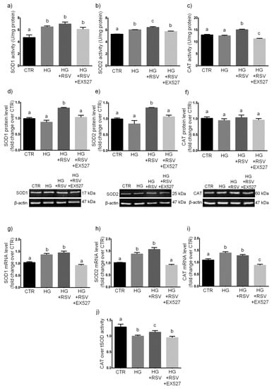 Effects of a 24-h treatment with either resveratrol alone (5 µM) or resveratrol+EX527 (5 µM and 13.4 µM, respectively) combination on the enzymatic activity (a–c), protein levels (d–f), and mRNA content (g–i) of superoxide dismutase 1 (a,d,g), superoxide dismutase 2 (b,e,h), and catalase (c,f,i) in high glucose-challenged HUVECs. The catalase over total superoxide dismutase ratio was also shown (j), as well as representative blots (d–f). Data are expressed as means and S.E.M. Abbreviations: CTR—vehicle; HG—high glucose; HG + RSV—high glucose + resveratrol; HG + RSV + EX527—high glucose + resveratrol + EX527; SOD1—superoxide dismutase 1; SOD2—superoxide dismutase 2; tSOD—total superoxide dismutase; CAT—catalase. Means sharing the same letter are not significantly different from each other (one-way ANOVA and Tukey’s multiple comparisons test): Panel (a): a vs. b, p < 0.05 (N = 3–4). Panel (b): a vs. b, p < 0.05; b vs. c, p < 0.05; a vs. c, p < 0.001 (N = 3–4). Panel (c): a vs. b, p < 0.001; b vs. c, p < 0.001; a vs. c, p < 0.05 (N = 3–4). Panel (d): a vs. b, p <.01 (N = 4). Panel (e): a vs. b, p < 0.05 (N = 4). Panel (f): (N = 4). Panel (g): a vs. b, p < 0.01 (N = 5). Panel (h): a vs. b, p < 0.05 (N = 3–5). Panel (i): a vs. b, p < 0.05; a vs. c, p < 0.05; b vs. c, p < 0.001 (N = 5). Panel (j): a vs. b, p < 0.001; b vs. c, p < 0.05; a vs. c, p < 0.05 (N = 3–4).