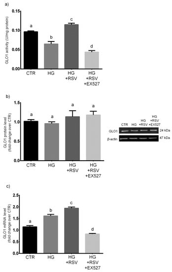 Interestingly, RSV overboosted GLO1 activity, which resulted to be even higher than that detected in untreated cells (p < 0.001, HG + RSV vs. HG; Figure 6a), and this was paralleled by augmented levels of GLO1 transcript (p < 0.01, HG + RSV vs. HG; Figure 6c), even though the amount of GLO1 protein remained unchanged (p > 0.05, HG + RSV vs. HG; Figure 6b).