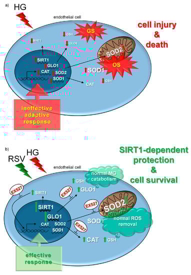 Synoptical interpretation of the experimental results. A 24-h treatment with HG induced both GS and OS in HUVECs by reducing SIRT1 activity, as well as by diminishing the efficiency of MG- and ROS-targeting defense. An attempt of compensation occurred at transcriptional level, however this was ineffective, as HG promoted apoptotic and necrotic cell death (a). The cytotoxic effects of HG were abolished by the co-treatment with RSV, and this was associated with transcriptionally-regulated restoration of SIRT1 activity, together with increased expression of GLO1, improved ROS-scavenging efficiency, and total suppression of HG-related GS and OS. The RSV-induced effective response to HG cytotoxicity was abolished by the specific inhibitor of SIRT1 (i.e., EX527), and this started at the level of mRNA transcription, thus suggesting that the upregulation of SIRT1 was essential for RSV to activate the major antioxidative and antiglycative defense, and avoid ROS- and MG-dependent molecular damages in a high glucose environment (b). Abbreviations: CAT—catalase; HG—high glucose; GLO1—glyoxalase 1; GS—glycative stress; GSH—reduced glutathione; OS—oxidative stress; RSV—resveratrol; SIRT1—sirtuin 1; SOD1—superoxide dismutase 1; SOD2—superoxide dismutase 2.