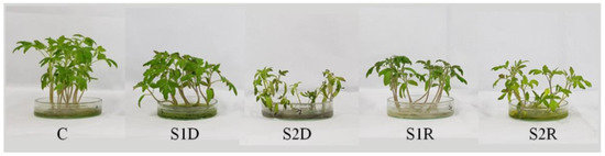 Visual differences of tomato plants under salinity (150 and 250 mM NaCl) and after a 48 h recovery period. (C, control; S1D, 150 mM NaCl; S2D, 250 mM NaCl; S1R, recovered 150 mM NaCl; and S2R, recovered 250 mM NaCl).