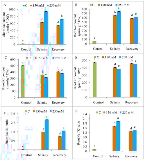 Content of Na+, K+ and Na+/K+ ratio (A) shoot Na+, (B) root Na+, (C) Shoot K+, (D) Root K+, (E) Shoot Na+/K+ ratio, and (F) root Na+/K+ in tomato plants under salinity (150 and 250 mM NaCl) and after a 48 h recovery period. Data means (±SD) were calculated from three replications. Statistically significant values are indicated by dissimilar letters (Fisher’s LSD test, P ≤ 0.05).