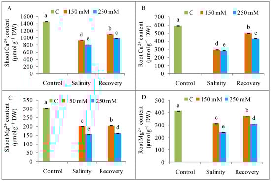 Content of Ca2+ and Mg2+ (A) shoot Ca2+, (B) root Ca2+, (C) shoot Mg2+, and (D) root Mg2+ in tomato plants under salinity (150 and 250 mM NaCl) and after a 48 h recovery period. Data means (±SD) were calculated from three replications. Statistically significant values are indicated by dissimilar letters (Fisher’s LSD test, P ≤ 0.05).