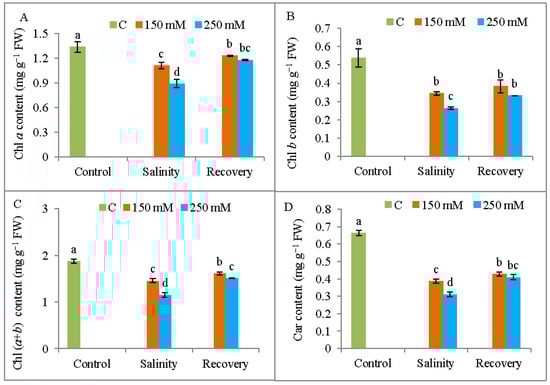 The leaf contents of Chl a and Chl b decreased by 33% and 51%, respectively, in response to 250 mM NaCl compare to control plants. The Chl (a + b) content was therefore similarly reduced relative to the unstressed control plants. However, both Chl a and Chl b contents were increased respective to the relevant stress treatments after the recovery period (Figure 6A–C). Car content also decreased by 42% and 53% in response to 150 and 250 mM NaCl, respectively, and it increased after the recovery period (Figure 6D).