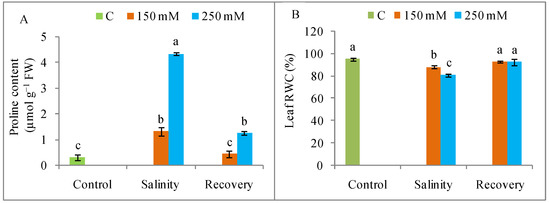 Proline levels were greatly increased by salt exposure compared to control (Figure 7A), but these levels declined significantly after the recovery period, by 68% and 72% in the plants treated with 150 and 250 mM NaCl, respectively. Salt stress reduced the leaf RWC, but this was restored after the recovery period (Figure 7B).