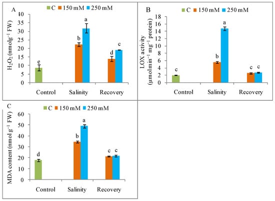 Oxidative stress markers (A) H2O2 content, (B) lipoxygenase (LOX) activity, (C) malondialdehyde (MDA) content in tomato plants under salinity (150 and 250 mM NaCl) and after a 48 h recovery period. Data means (±SD) were calculated from three replications. Statistically significant values are indicated by dissimilar letters (Fisher’s LSD test, P ≤ 0.05).