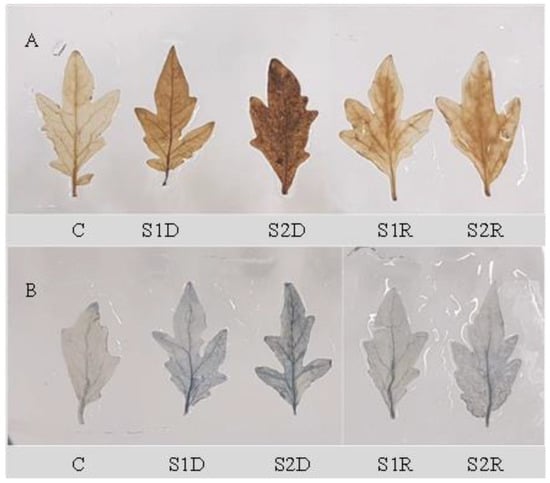 Increased generation of H2O2 and O2•− in tomato leaves was histochemically confirmed using 3,3-diaminobenzidine (DAB) and nitrobluetetrazolium (NBT), respectively [19].