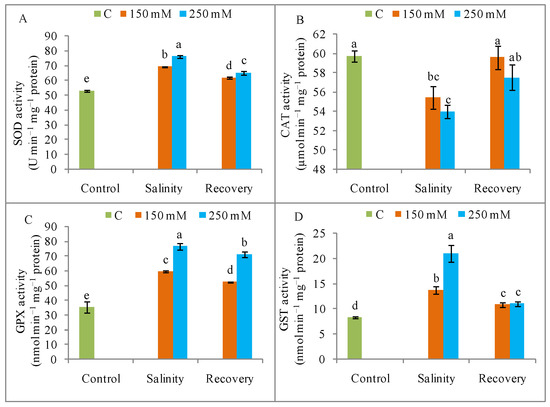 (A) Activities of superoxide dismutase (SOD), (B) catalase (CAT), (C) glutathione peroxidase (GPX), and (D) glutathione S-transferase (GST) in tomato plants under salinity (150 and 250 mM NaCl) and after a 48 h recovery period. Data means (±SD) were calculated from three replications. Statistically significant values are indicated by dissimilar letters (Fisher’s LSD test, P ≤ 0.05).