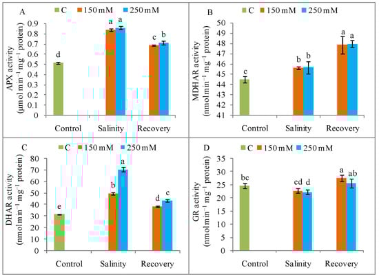 Activities of ascorbate peroxidase (APX) (A), monodehydroascorbate reductase (MDHAR) (B), dehydroascorbate reductase (DHAR) (C), and glutathione reductase (GR) (D) in tomato plants under salinity (150 and 250 mM NaCl) and after a 48 h recovery period. Data means (±SD) were calculated from three replications. Statistically significant values are indicated by dissimilar letters (Fisher’s LSD test, P ≤ 0.05).