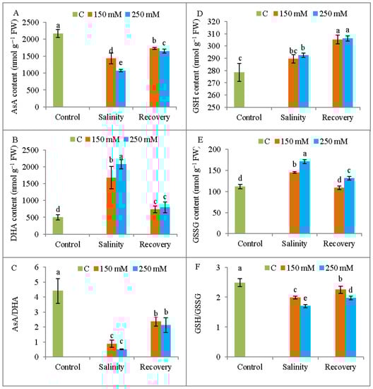 Content of AsA (A), dehydroascorbate (DHA) (B), AsA/DHA ratio (C), GSH (D), GSSG(E), and GSH/GSSH ratio (F) in tomato plants under salinity (150 and 250 mM NaCl) and after a 48 h recovery period. Data means (±SD) were calculated from three replications. Statistically significant values are indicated by dissimilar letters (Fisher’s LSD test, P ≤ 0.05).