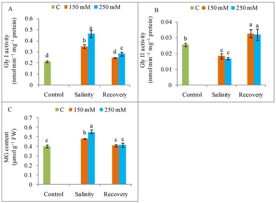 Methylglyoxalase detoxification (A) and activities of glyoxalase enzymes (B) Gly I, (C) Gly II in tomato plants under salinity (150 and 250 mM NaCl) and after a 48 h recovery period. Data means (±SD) were calculated from three replications. Statistically significant values are indicated by dissimilar letters (Fisher’s LSD test, P ≤ 0.05).