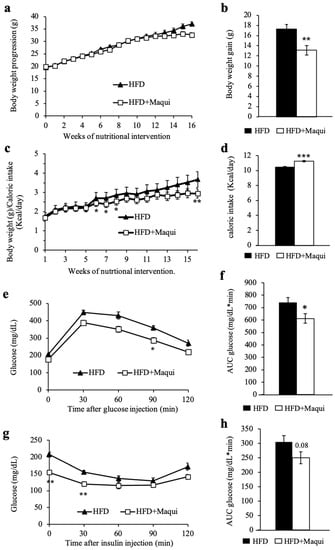 3.2. Maqui Dietary Supplementation Reduces HFD-Induced Body Weight Gain and Improves Insulin Sensitivity in Mice