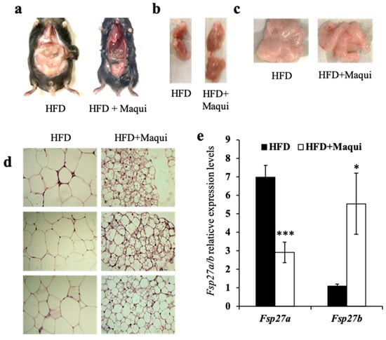 In the context of browning, recent publications have shown the relevance of fat-specific protein 27 (FSP27) isoforms in the phenotype of unilocular or multilocular lipid droplets. FSP27 is considered to be, at least in part, the protein responsible for the formation and growth of lipid droplets (LDs). Two isoforms have been described with different expression patterns and functions. Fsp27a is expressed in WAT, where it promotes the formation of large LDs. By contrast, BAT expresses the Fsp27b isoform that contributes to the ensemble of smaller LDs [,]. To confirm the brown-like phenotype of scWAT in HFDM mice, the mRNA levels of both Fsp27 isoforms were measured. The results indicated that the dietary maqui supplementation causes a shift in the expression pattern of Fsp27. The scWAT depot of HFDM mice showed a significant reduction in the levels of Fsp27a and a significant induction of Fsp27b expression (Figure 2e), thus reinforcing the idea that maqui causes a brown-like phenotype in the scWAT.