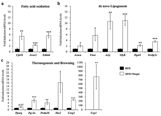 Maqui induces the expression of genes from de novo lipogenesis, fatty acid oxidation, thermogenesis/browning in scWAT. The relative mRNA levels of characteristic genes of (a) mitochondrial and peroxisomal FAO (Cpt1b, Acox3, and Ehhadh), (b) DNL (Acaca, Acly, Fasn, GlyK, Dgat1 and Srebp1c) and (c) thermogenesis and browning (Ucp1, Type 2 Iodothyronine Deiodinase (Dio2), PR-Domain Zinc Finger Protein 16 (Prdm16), Peroxisome proliferator-activated receptor gamma (Pparg), Peroxisome proliferator-activated receptor gamma coactivator 1 alpha (Pgc1a) and Cellular repressor of adenovirus early region 1A–stimulated genes 1 (CREG1)) were measured using qRT-PCR in scWAT of HFD and HFDM mice. Bars represent the fold induction in the mRNA levels versus the HFD animals that are considered the control group, which produces an arbitrary value of 1. Data are presented as the mean ± SEM. * p < 0.05, ** p < 0.01, *** p < 0.001 versus the HFD group.