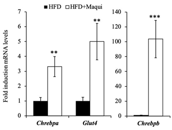 Maqui induces the expression of Chrebpa, Chrebpb and Glut4 in scWAT. The relative mRNA levels of Glut4, Chrebpa and Chrebpb were measured by qRT-PCR in scWAT of HFD and HFDM mice. Bars represent the fold induction in the mRNA levels versus the HFD animals that are considered the control group and assigned an arbitrary value of 1. Data are presented as the mean ± SEM. ** p < 0.01, *** p < 0.001 versus the HFD group.