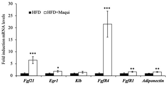 Obesity is considered an FGF21-resistant state usually due to a downregulation of the fibroblast growth factor receptor (FGFR) and/or its co-receptor β-klotho (KLB) that impairs FGF21 signaling [,]. To analyze the effect of maqui berry supplementation on the FGF21 signaling, the mRNA levels of Fgf21 itself, Fgfr1, Fgfr4 and KLB were determined. Moreover, to analyze the functionality of the FGF21 signal transduction pathway, the expression levels of Egr-1 and adiponectin were measured. Figure 5 shows that, in scWAT, both the FGF21 and its receptors (FGFR1 and FGFR4) were significantly overexpressed in HFDM mice versus the HFD mice (Figure 5). These data, together with the induction of Egr-1 and adiponectin in scWAT (Figure 5), indicate that maqui supplementation improves FGF21 signaling and effectiveness in scWAT.
