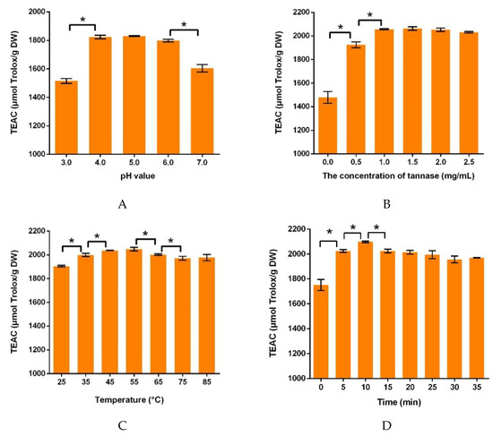 The effects of single factors on the Trolox equivalent antioxidant capacity (TEAC) values. (A) the pH value of buffer solution; (B) tannase concentration; (C) ultrasonic temperature and (D) ultrasonic time. DW: dry weight. * Data between groups were significantly different (p < 0.05).