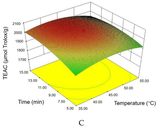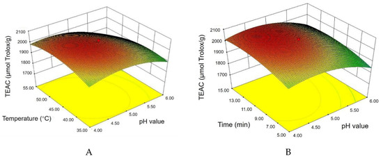 The interrelation of independent variables and response values were visually displayed via the 3D response plots in Figure 2. As is shown in Figure 2A, the TEAC values were performed as a function of pH value and ultrasonic temperature with a fixed ultrasonic time. When ultrasonic time was kept at 10 min, the TEAC values increased slowly with the increase of pH value from 4.00 to 5.00, then dropped from 5.00 to 6.00. In addition, the TEAC values increased with the increase of ultrasonic temperature from 35 °C to 45 °C, then decreased slightly from 45 °C to 55 °C. Figure 2B presents the interactions between the pH value and ultrasonic time on the TEAC values at 45 °C. The effects of the pH value on the TEAC value were similar to that shown in Figure 2A. The increase in the ultrasonic time slightly elevated the TEAC values from 5.00 to 15.00 min. Moreover, Figure 2C displays that under the condition of fixed pH value, the antioxidant capacities markedly improved as the ultrasonic temperature and time increased. The effect of ultrasonic time was more potent than that of ultrasonic temperature. According to the results of ANOVA and response surfaces plots, the pH value and ultrasonic time had stronger effects on antioxidant capacities than that of ultrasonic temperature.