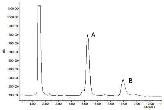 A representative high-performance liquid chromatography (HPLC) chromatogram of Capsicum annuum cultivar Colorado State University (CSU) 256 green showing baseline separation of (A) capsaicin, and (B) dihydrocapsaicin using Waters, Nova-Pak C18 column using fluorescence detector. Peaks were identified by comparing retention times to those of standard compounds (capsaicin and dihydrocapsaicin).