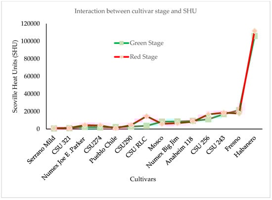 The interactions between cultivars, stages and SHUs were summarized in Figure 5. The interaction plot, shows that the lines of the two stages are not parallel, that means there is a statistically significant interaction between cultivars and stages except in Serrano Mild. CSU 321, CSU 290 and CSU 243 cultivars. The differences between some cultivars are not evident because they are masked by the higher values of Habanero cultivar.