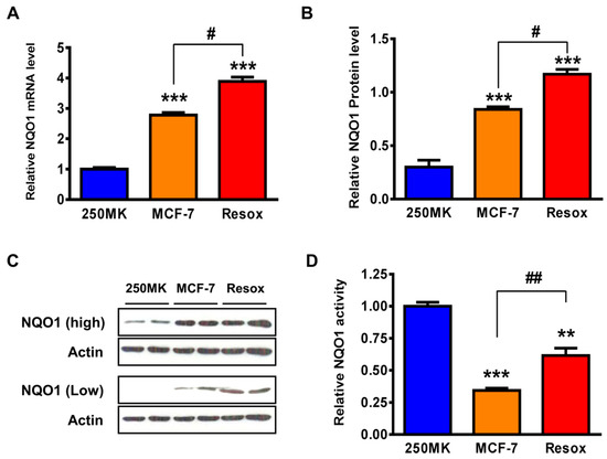 Basal levels of NQO1 expression in 250MK, MCF-7 and Resox cells. (A) NQO1 mRNA level was measured by real-time PCR. Data are means ± SEM (n = 3). (B) NQO1 protein levels normalized to β-actin were measured by immunoblotting. Data are means ± SEM (n = 3). (C) NQO1 expression detected by immunoblotting (low and high exposure times). (D) NQO1 enzyme activity. Data are means ± SEM (n = 3). Statistics: One-way ANOVA for (A,B,D). ** p < 0.01, *** p < 0.001 versus 250MK. # p < 0.05, ## p < 0.01 versus MCF-7. Abbreviations: NQO1: NAD(P)H: quinone oxidoreductase 1.