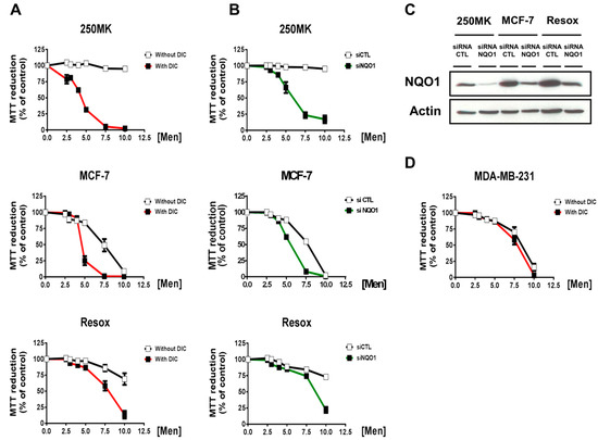 Figure 3 shows that 250MK cells were resistant to the pro-oxidant treatment, in contrast to MCF-7 and Resox cells. Such oxidant treatment was induced by exposing cells to a H2O2-generating system (ascorbate and menadione), a mixture widely used in our laboratory to induce an oxidative stress [18,19,20,21,22]. Pharmacological inhibition of NQO1, by using dicoumarol, considerably increased the cytotoxicity in the three cell lines (Figure 3A). These results were then confirmed by genetic inactivation using a specific siRNA against NQO1 (Figure 3B,C). Unless ascorbate (Asc)/menadione (Men)-mediated cytotoxicity was not modified by dicoumarol in MDA-MB-231 cells (Figure 3D).