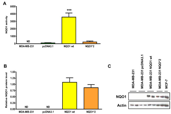 As shown in Figure 4A, NQO1*1-overexpressing cells had about a 10-fold greater NQO1 activity than NQO1*2-overexpressing cells, despite the fact that both cells have similar NQO1 protein levels (Figure 4B,C). This result confirms that the presence of the polymorphism NQO1*2 is associated with a decrease in NQO1 activity [13].