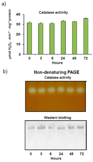 Catalase activity and protein content as a function of time in crude extracts from sweet pepper fruits. (a) Total enzyme activity. Samples were incubated at 4 °C for 0 to 72 h and then analyzed for catalase activity. Results are means ± SEM of samples from at least three different experiments, while the ANOVA test (p < 0.05) was used for statistical analysis. (b) Activity and protein level of the catalase isoenzyme as a function of time in pepper fruit. Prior to electrophoresis, samples were incubated at 4 °C for 0 to 72 h. Native electrophoresis was performed in 6% acrylamide gels for these assays. Green pepper fruit samples (20 μg protein) were used for catalase activity staining in gels. For western blot assays, pepper fruit samples (20 μg protein) were loaded onto gels and catalase was detected using an antibody against Arabidopsis thaliana catalase (1:5000 dilution). Shown pictures are representative of the non-denaturing PAGE and western blotting assays from at least three independent experiments.