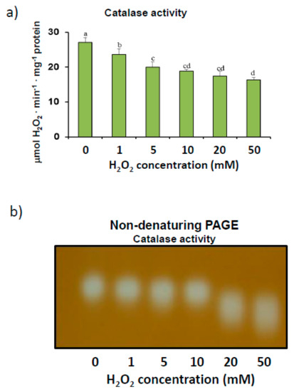 We also analyzed catalase enzyme activity after the pepper crude extracts were incubated with increasing concentrations of H2O2. Although catalase commonly reacts to hydrogen peroxide substrates, further analysis of enzyme kinetics showed that the incubation of extracts with more than 5 mM H2O2 for 30 min at 25 °C inhibited catalase activity by up to 40% at an H2O2 concentration of 50 mM (Figure 2a). This reduction in activity was confirmed by non-denaturing PAGE, which showed fainter activity bands as concentrations of H2O2 were increased during incubation (Figure 2b). These assays, which also detected only one activity band, showed higher electrophoretic mobility levels in 6% acrylamide gels with increasing concentrations of H2O2, thus suggesting potential catalase oxidation.
