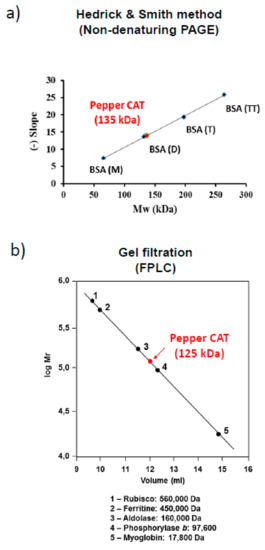 In order to gain a deeper insight into how these modulations occur in pepper fruit catalase, a preliminary molecular characterization of the enzyme was carried out using catalase-enriched fractions. Thus, crude extracts from pepper fruits were fractionated by ammonium sulfate precipitation, which were then studied using FPLC size exclusion chromatography (see materials and methods above). Native molecular weight and structure were investigated using two distinct methods. The Hedrick and Smith electrophoretic method found that the native enzyme in non-denaturing gels [54] had a molecular weight of 135 kDa (Figure 4a), while the weight of the native enzyme determined by the gel filtration method was roughly similar, at approximately 125 kDa (Figure 4b).