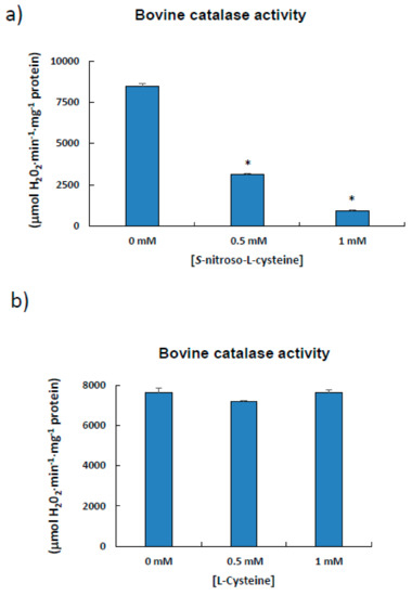 Effect of S-nitroso-L-cysteine (CSNO) on catalase from bovine liver. The enzyme (1 μL; Sigma-Aldrich, aqueous suspension, 10,000–40,000 units/mg protein) was incubated for 1 h at 25 °C in the absence/presence of different concentrations of either S-nitroso-L-cysteine (a) or L-cysteine (b) prior to determining catalase activity. Results are means ± SEM of samples from at least three different experiments. Asterisks (*) denote significant differences in treatments with respect to control conditions in the absence of agents (student t-test, p < 0.05).