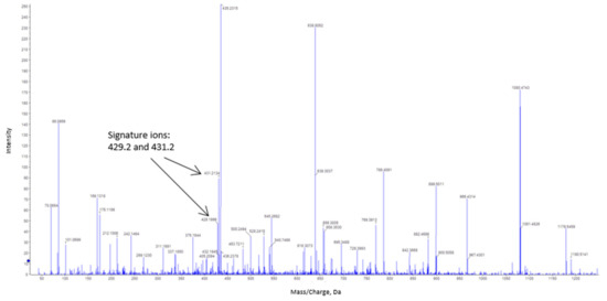 The procedure used to detect S-nitrosated cysteines uses an improved combination of nLC and MS to discriminate biotin-labeled polypeptides following trypsin digestion. Figure 6 shows the fragmentation spectrum (MS/MS) of peptides labeled with biotin-HPDP obtained after tryptic digestion of bovine catalase previously treated with CSNO. Two typical HPDP-biotinylated fragments are highlighted according to their corresponding signal intensities. Analysis of the mass/charge ratio of both fragments showed a 15 amino acid-long polypeptide, with an L366GPNYLQIPVNC377PYR380 sequence, in which biotin is putatively bound. This matches the reference sequence (NP_001030463.1) located between Leu366 and Arg380 obtained from the NCBI database. Thus, Cys377 from bovine catalase appears to be a candidate for S-nitrosation. The catalase aliquot, which was previously incubated with NEM, did not display any biotin labeling.