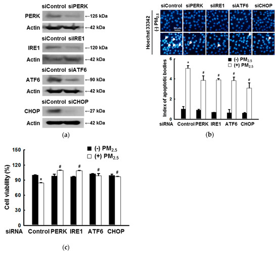Endoplasmic reticulum (ER) stress mediates apoptosis after exposure to particulate matter 2.5 (PM2.5). (a) HaCaT cells were transfected with control siRNA and siRNAs against PERK, IRE1, ATF6, and CHOP as verified by western blotting. The control, PERK, IRE1, ATF6, and CHOP siRNA-transfected cells were treated with PM2.5. (b) Nuclei were stained with Hoechst 33342 and images were acquired using a fluorescence microscope. Arrows indicate apoptotic cells. (c) Cell viability was assessed using MTT assay. (b,c) * p < 0.05 compared to siControl; # p < 0.05 compared to siControl + PM2.5.