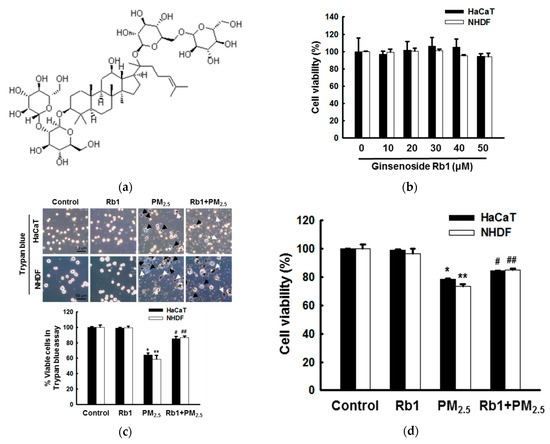 As the concentration of PM2.5 in the air is increasing daily, there is an urgent need to develop appropriate countermeasures to PM2.5-induced damage. Rather than focusing on ways to remove the causes of PM2.5 exposure, our first priority should be to prevent the detrimental effects of PM2.5 on health. Therefore, we are committed to exploring bioactive substances that are resistant to PM2.5 and to studying their mechanisms. Ginsenosides have long been known to increase immunity, relieve fatigue, and eliminate toxins. However, among the more than 30 types of ginsenosides, only ginsenoside Rg1 has been tested for its effectiveness against PM2.5 [14,15], and whether ginsenoside Rb1 has a protective effect on skin cells exposed to PM2.5 has not been studied until now.