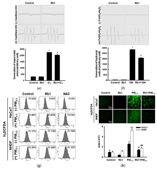 Ginsenoside Rb1 confers protection from PM2.5-induced intracellular reactive oxygen species (ROS). (a) Chemical structure of ginsenoside Rb1. (b) Cells were seeded, and ginsenoside Rb1 was added at final concentrations of 10, 20, 30, 40, and 50 μM. After 24 h, cell viability was determined using the MTT assay. (c,d) Cells were pre-treated with ginsenoside Rb1 (40 μM) for 1 h, treated with PM2.5 (50 μg/mL), incubated for 24 h, (c) stained with trypan blue reagent, and visualized using a phase contrast microscope to evaluate cell viability. Black arrows indicate dead cells and white arrows indicate PM2.5. (d) Cell viability was assessed using MTT assay. (e) Superoxide anions generated by the xanthine/xanthine oxidase system were reacted with DMPO and the resultant DMPO/·OOH adducts were detected using ESR spectrometry. * p < 0.05 compared to the control; # p < 0.05 compared to superoxide anions. (f) Hydroxyl radicals generated by the Fenton reaction (H2O2+FeSO4) were reacted with DMPO and the resultant DMPO/·OH adducts were detected by ESR spectrometry. * p < 0.05 compared to the control; # p < 0.05 compared to hydroxyl radicals. (g,h) Cells were pre-treated with ginsenoside Rb1 or NAC for 1 h and then treated with PM2.5 for the indicated time periods. ROS levels were assessed by (g) flow cytometry and (h) confocal microscopy after H2DCFDA staining (FI: Fluorescence intensity). (c,d,h) *,** p < 0.05 compared to the control groups of both HaCaT and NHDF cells, respectively; #,## p < 0.05 compared to PM2.5-treated groups of both HaCaT and NHDF cells, respectively.