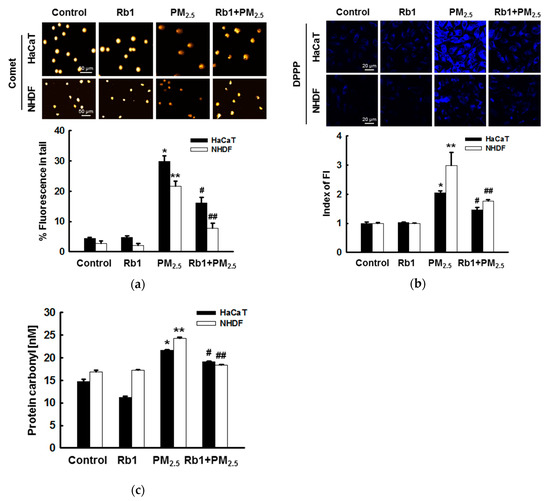 Next, we evaluated the effect of ginsenoside Rb1 pre-treatment on the intracellular macromolecules damaged by PM2.5. Comet assays to assess DNA degradation showed that PM2.5 increased the concentration of DNA in the tails of cells by 30% and 22%, whereas pretreatment with ginsenoside Rb1 reduced this to 16% and 8% in HaCaT and NHDF cells, respectively (Figure 3a). In addition, determination of DPPP oxide fluorescence to identify lipid peroxidation was performed in PM2.5-treated cells, and fluorescence was significantly reduced after pre-treatment with ginsenoside Rb1 (Figure 3b). Similarly, the level of carbonylation in biomarkers of oxidative damage proteins in PM2.5-treated cells was relatively high, and ginsenoside Rb1 prevented this PM2.5-induced carbonyl formation (Figure 3c). Taken together, these results indicate that ginsenoside Rb1 protects intracellular components from damage by inhibiting oxidative stress caused by PM2.5-induced ROS.